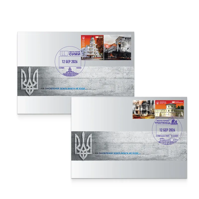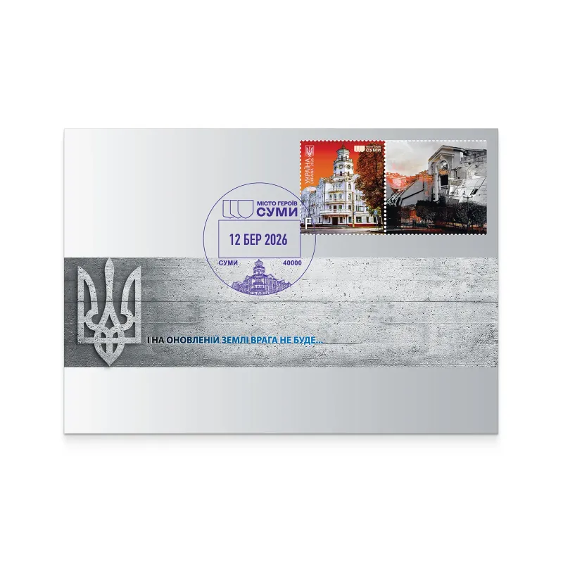 The postage stamp block “Cities of Heroes. Sumy Region” depicts the K3 building of Sumy State University (Sumy) and the “Round Yard” (Trostianets).