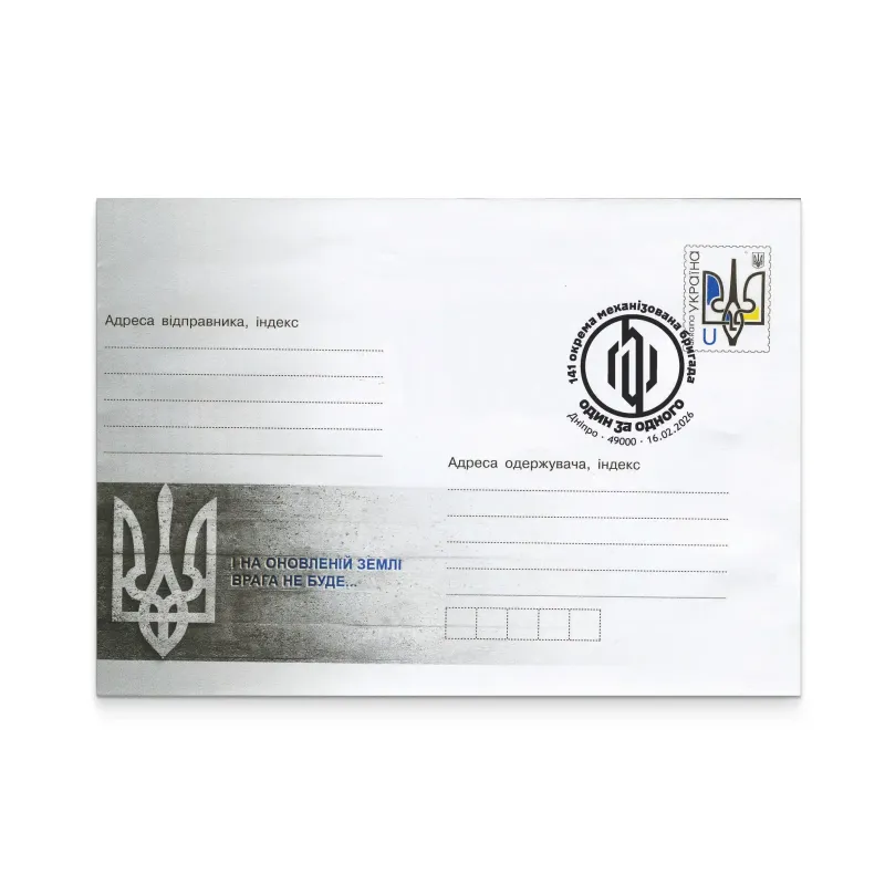 The marked artistic envelope "And there will be no enemy on the renewed land..." bears the postmark “Trident” with the imprint of a special cancellation “141st separate mechanized brigades”.