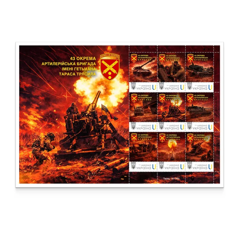 a sheet of 28 stamps “43rd Separate Artillery Brigade named after Hetman Taras Triasylo” under the “Personalized Stamp” project (unnumbered, unlimited circulation);