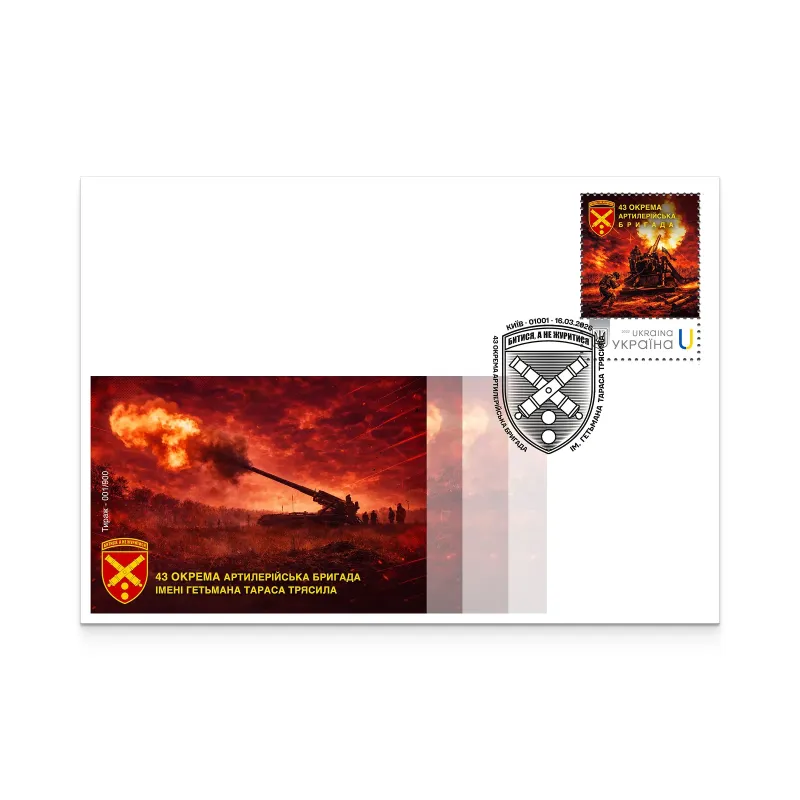 On March 16, 2026, a special cancellation ceremony for the “43rd Separate Artillery Brigade named after Hetman Taras Triasylo” will take place in Kyiv at the main post office (22 Khreshchatyk Street) from 2:00 p.m. to 8:00 p.m.