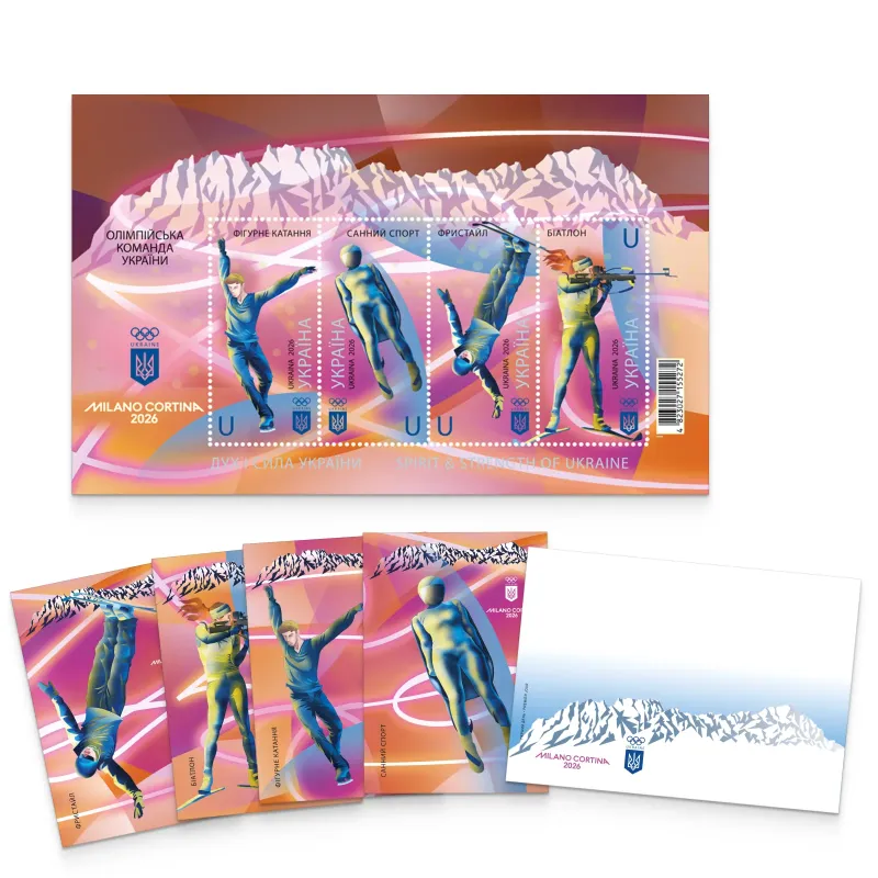 The proposed postage set includes a block “Spirit and Strength of Ukraine. Milano Cortina 2026”, сover “First Day” and 4 cards.