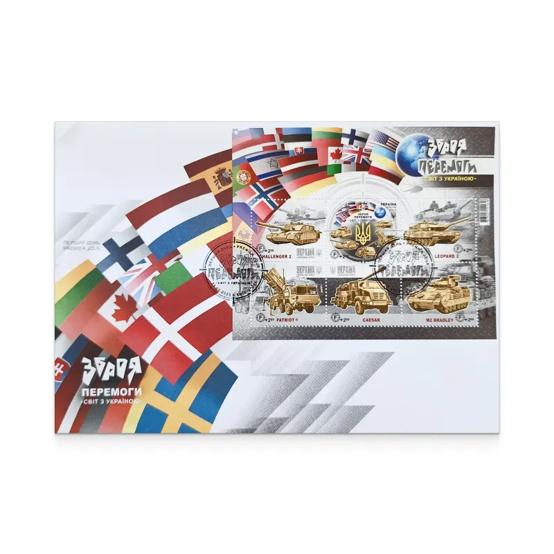 The proposed postage set includes: a block “Weapons of Victory. World with Ukraine” and сover “First Day” with special cancellation.