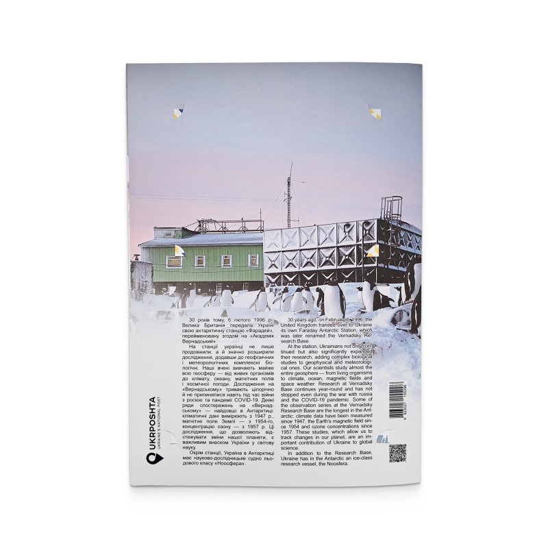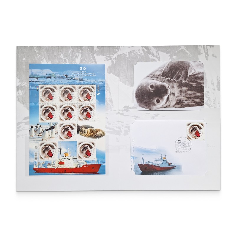 The booklet contains a stamp sheet “30 years of the Antarctic station Academician Vernadsky", cover “First Day” with special cancellation and a card. The booklet contains a description of the issue in Ukrainian and English.