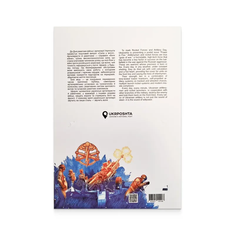 The booklet contains a stamp sheet “On the Day of Rocket Forces and Artillery. Strength in Fire”, cover “First Day” with the cancellation “First Day. Kyiv”. The booklet contains a description of the issue in Ukrainian and English.