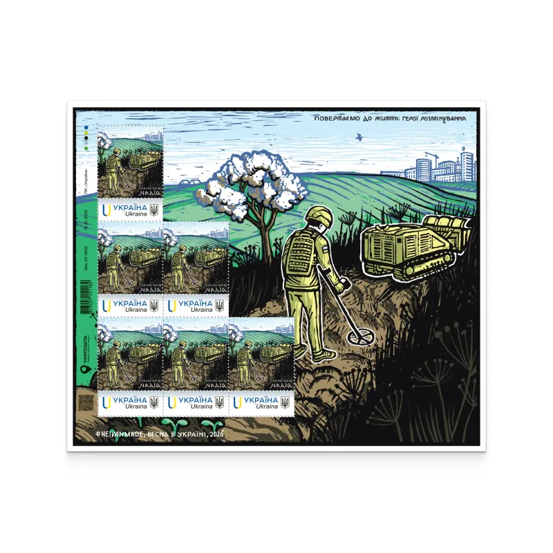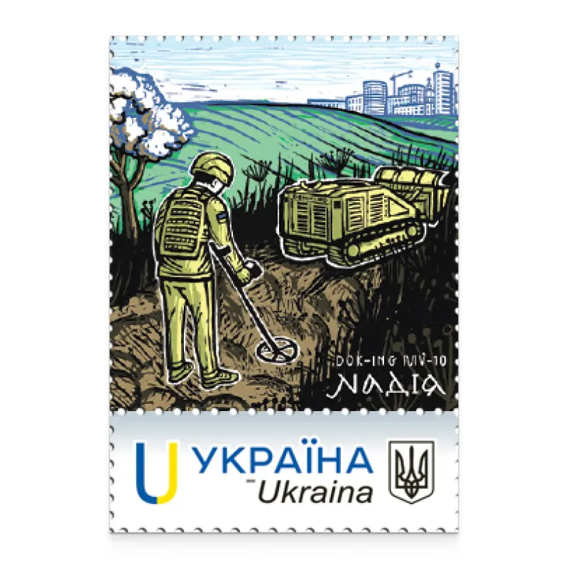 The stamp issue is intended to honor the daily, extremely difficult, and dangerous work of deminers who clear Ukrainian territories of explosive ordnance, and was produced with the support of the Croatian demining vehicle manufacturer DOK-ING, the Ministry of Economy of Ukraine, the State Emergency Service of Ukraine, and the State Special Transport Service.