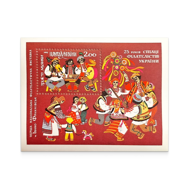 The block is decorated with an image of young people in Hutsul festive costumes performing a fiery dance to the sounds of the instruments depicted on the stamp. The issue harmoniously reflects the unity of music, dance and rich national flavor, conveying the unique atmosphere of Ukrainian traditions.