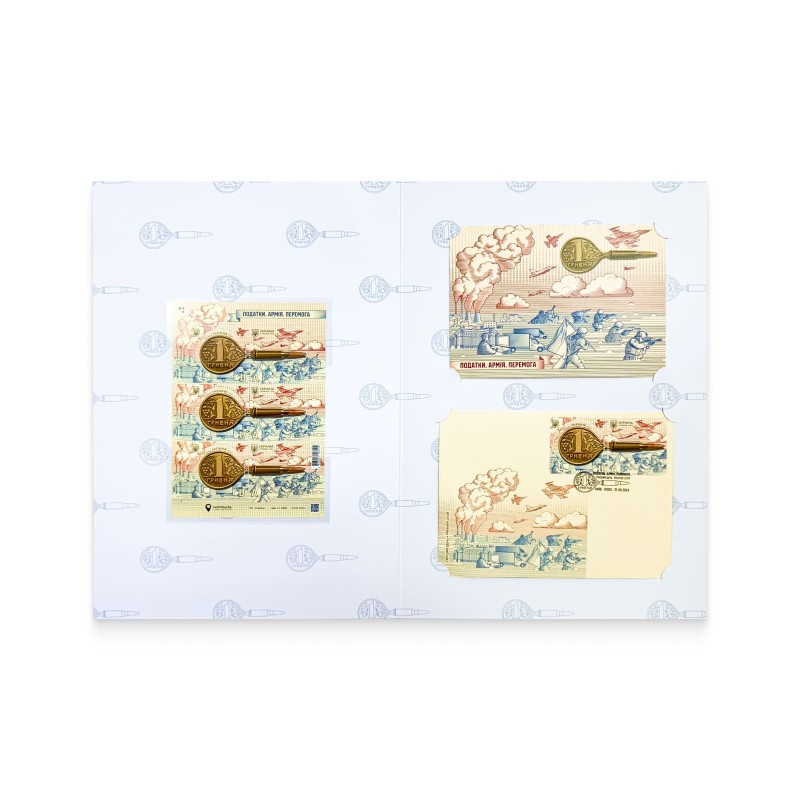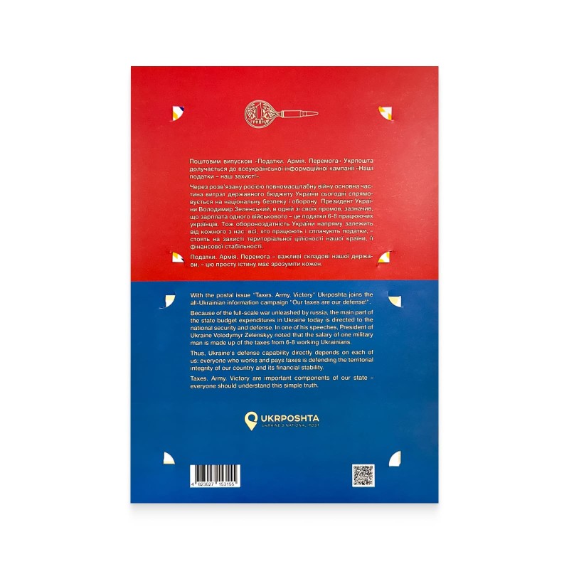 Поштовим випуском «Податки. Армія. Перемога» Укрпошта долучається до всеукраїнської інформаційної кампанії «Наші податки — наш захист!». Через розв’язану росією повномасштабну війну основна частина витрат державного бюджету України сьогодні спрямовується на національну безпеку і оборону. Президент України Володимир Зеленський, в одній зі своїх промов, зазначив, що зарплата одного військового — це податки 6-8 працюючих українців. Тож, обороноздатність України напряму залежить від кожного з нас: всі, хто працює і сплачує податки, — стоять на захисті територіальної цілісності нашої країни, її фінансової стабільності. Податки. Армія. Перемога – важливі складові нашої держави, – цю просту істину має зрозуміти кожен. На поштовому випуску зображено монету НБУ номіналом 1 гривня (художник Василь Лопата).