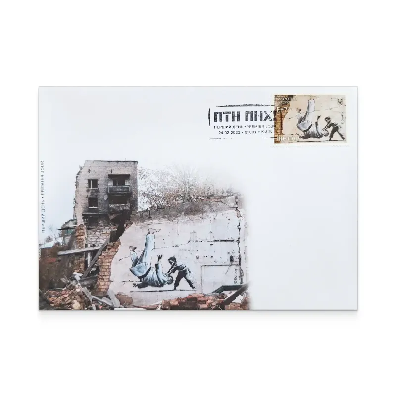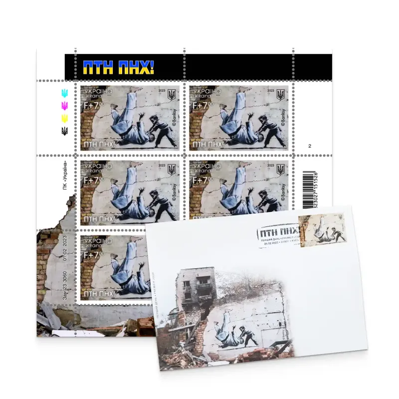 24 лютого 2022 р. близько 4-ї год. ранку за київським часом президент рф оголосив про «спеціальну воєнну операцію» в Україні, після чого російські війська нанесли ракетні удари по Україні та почали повномасштабний воєнний наступ.  2022-й для українців став роком національного єднання, роком мужності й звитяги, роком витривалості й самопожертви. Український народ вразив світ і був удостоєний престижних міжнародних відзнак: ім. Карла Великого (за захист європейських цінностей), ім. Андрія Сахарова (за свободу думки), від The Atlantic Council (за визначне лідерство), Фонду ім. Казимира Пулавського — «Лицар свободи» тощо. На поштовому випуску, присвяченому річниці повномасштабного вторгнення росії в Україну, представлено одне з семи графіті англійського художника Бенксі, створених ним в Україні у 2022 р. Графіті з дзюдоїстом, відправленим в нокаут, художник намалював на стіні зруйнованого будинку у селищі Бородянка (Київська обл.).