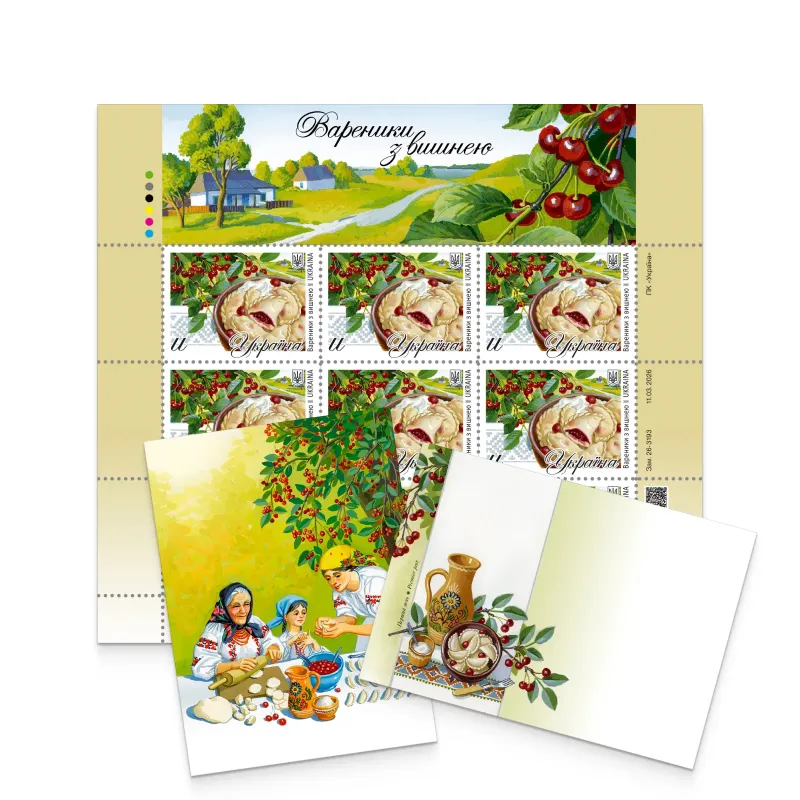 Поштовий набір включає: аркуш «Вареники з вишнею», художній конверт формату С6 та картку.