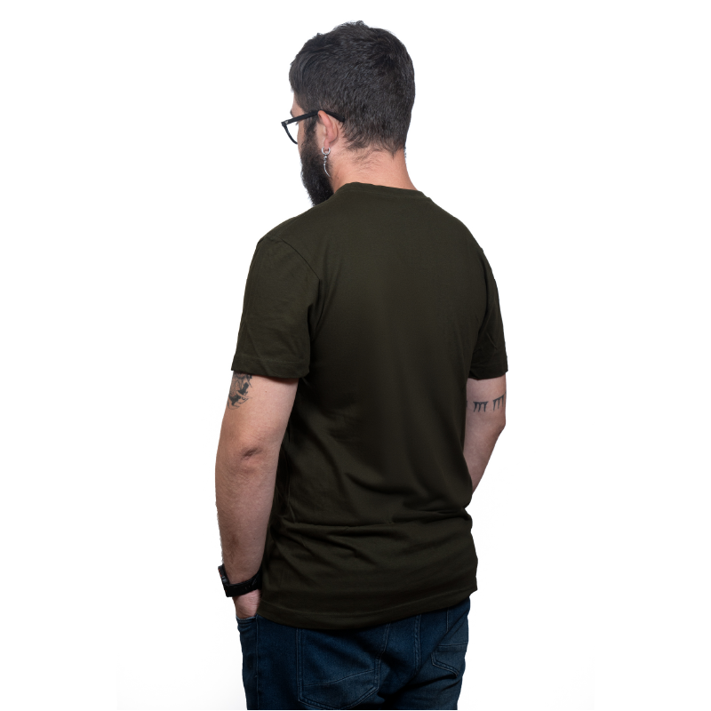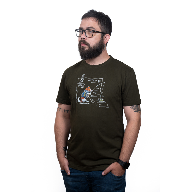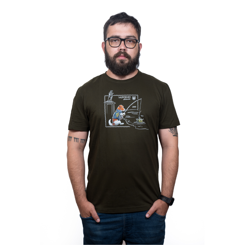 Футболка «унісекс» прямого силуету, виготовлена з бавовни. Акцентний елемент — принт із зображенням популярної поштової марки «Патрон».